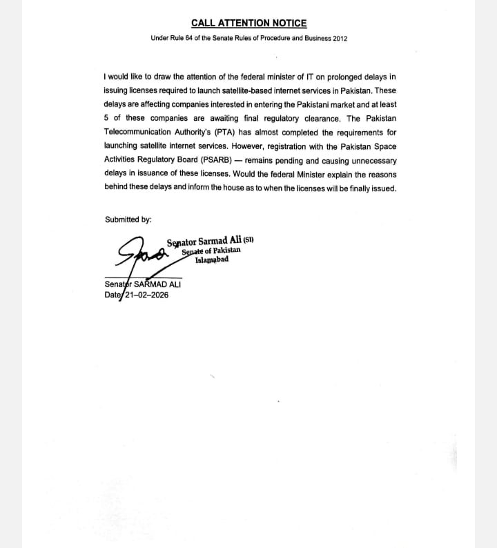 Senator Sarmad Ali submitted a notice in the Senate, drawing attention to the hold-up in granting licenses to satellite internet companies. The notice called on the Federal Minister for IT and relevant authorities to explain the reasons for withholding approvals.